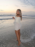Our Marissa Mini Dress is a chic and stylish addition to your wardrobe. Featuring a strapless neckline, it exudes modern elegance while highlighting the shoulders beautifully. With long sleeves and overlay, it adds a touch of sophistication to the ensemble. The elasticated top edge ensures a comfortable and secure fit, allowing you to move with ease throughout the day. Crafted with a soft boucle knit feel, it offers a luxurious and tactile experience. Unlined for a lightweight and breathable feel, this dress is perfect for warm-weather styling. Whether dressed up with heels for a night out or styled casually with sandals for a daytime look, our Marissa Mini Dress is sure to make a statement with its effortless charm and contemporary flair.